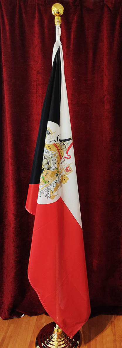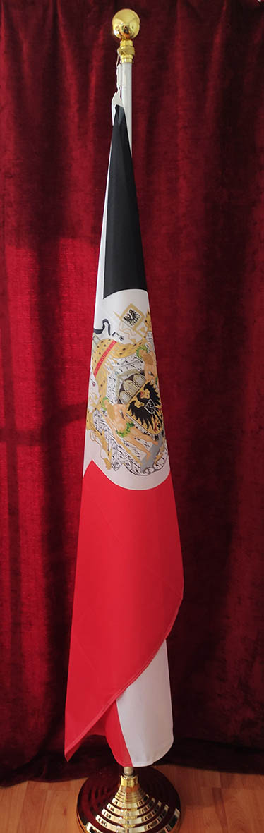 Die Flagge (ohne Ständer) hat zwei Kunststoffkarabinerhaken. Material glänzendes Polyestergewirke, hohe Farbbrillanz, waschbar, schnelltrocknend, schwer entflammbar. Größe 150 x 90 Anordnung: schwarz-weiß-roth.